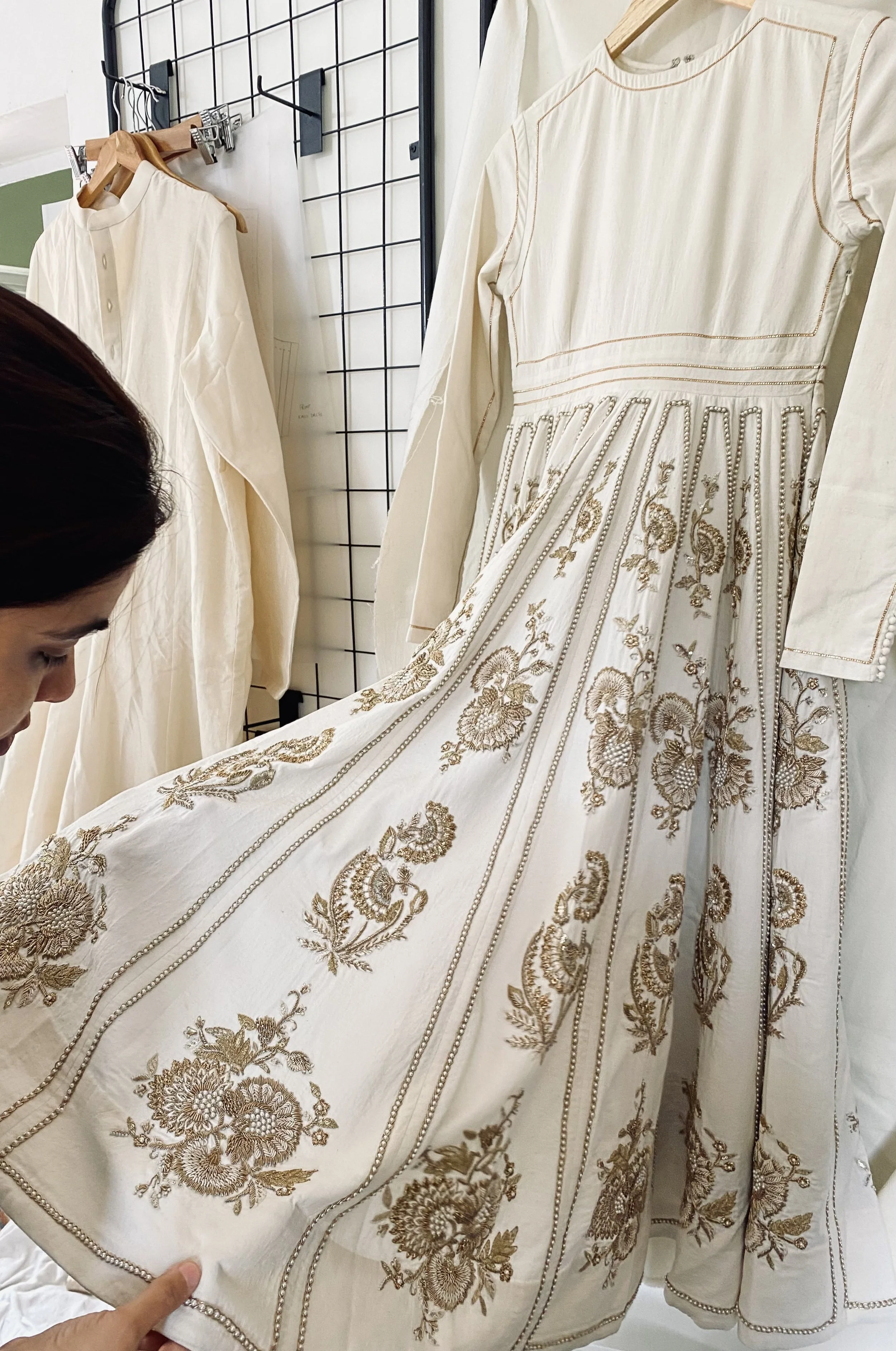 Once we are happy with the final layout, we transfer the engineered technical pattern onto the final fabric - ready to attach to the embroidery frames and let the master Karigars (artisans) to do their magic.